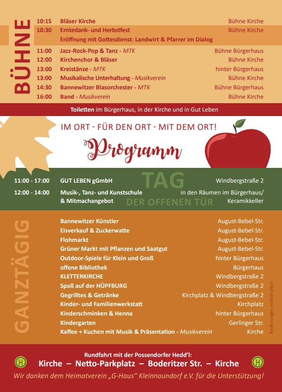 Bei strahlendem Wetter zog es zahlreiche Besucherinnen und Besucher auf das Festgelände zwischen Kirche und Bürgerhaus. Das Fest wurde gemeinsam von Bürgermeister Heiko Wersig und Pfarrer Wolf-Jürgen Grabner eröffnet. Lokale Künstler, Kunsthandwerker und Geschäfte präsentierten an ihren Ständen eine bunte Vielfalt an hübschen dekorativen und nützlichen Produkten. Auch kulinarisch war alles dabei, was das Herz begehrt: Von selbst gebackenen Kuchen bis zu deftiger Bratwurst. Für die jüngsten Besucher gab es zahlreiche Attraktionen und Spiele, die für viel Spaß sorgten. Ein weiteres Highlight des Tages war die historische „Possendorfer Heddl“. Damit konnte man zum Tag der offenen Tür bei ‚Gut Leben‘, zum ‚Kindergarten Regenbogen‘ und der ‚Tagespflege der Diakonie‘ fahren. Die engagierten Darbietungen der Musik-, Tanz- und Kunstschule sowie die Aufführung des Leubnitzer Männerchors kamen bei den Besuchern ebenfalls gut an und erhielten viel Applaus.